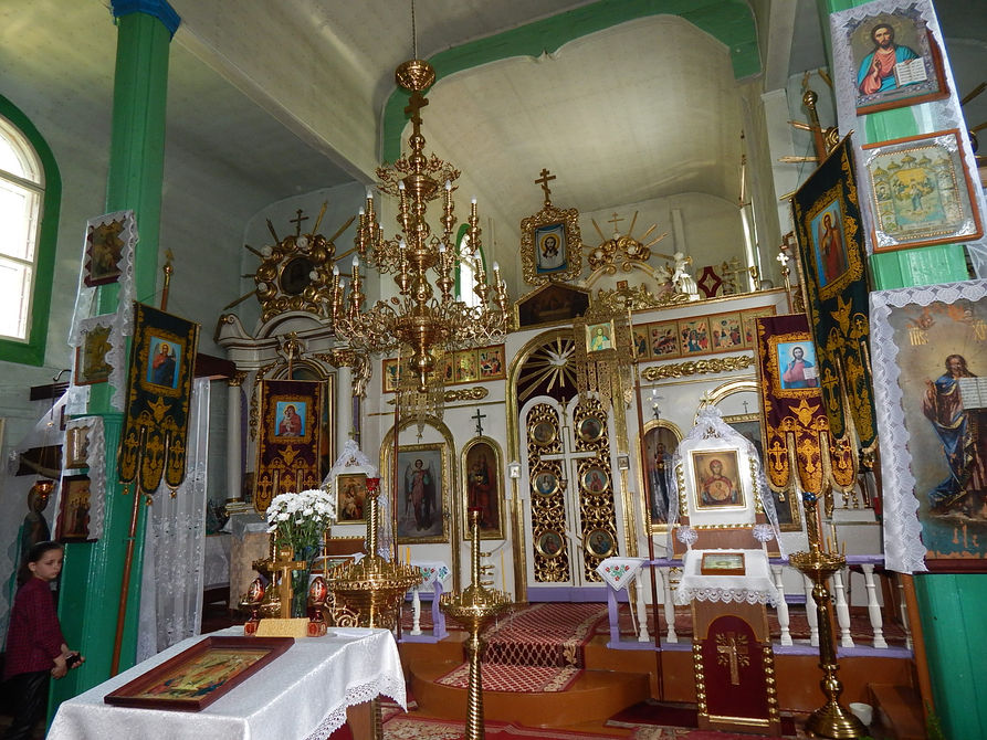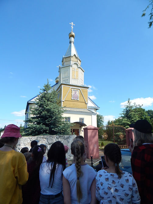 Волчин. Экскурсию с погружением в историю своей родной деревни нам провела местный краевед Галина Качановская, которая подготовила ребятам небольшую выставку исторических экспонатов. С её помощью мы смогли посмотреть на внутреннее убранство Свято-Николаевской церкви, которая относится к памятникам архитектурного наследия Беларуси.